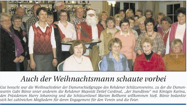 Gewohnt gut besucht war die Weihnachtsfeier der Damenschiessgruppe des Rehdener Schützenvereins, zu der die Damenwartin Gabi Bünte ganz besonders die Rehdener Majestät Detlef Cardinal „der Standfeste“ mit Königin Karina, den Präsidenten Harry Johanning und die Schützenliesel Marion Bollhorst willkommen hieß. Sie bedankte sich bei Heidi Imsande, Britta Weise, Karina Cardinal und Katja Schwierking , die in diesem Jahr für die Organisation zuständig waren.
