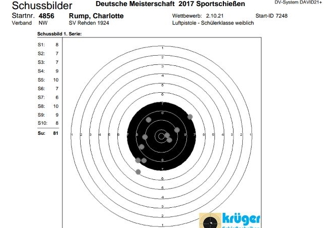 Bei der Kreismeisterschaft hatte sie 129 Ring auf die Scheibe gebracht, bei der Bezirksmeisterschaft waren es schon 149 Ring, die Landesmeisterschaft beendete sie dann schon mit 155 Ring, sieben Ring über dem Limit der Deutschen Meisterschaft von 148 Ring. Da ist es schon toll, dass sie die Nervenstärke hatte und bei der Deutschen Meisterschaft noch sechs "drauf packen konnte.