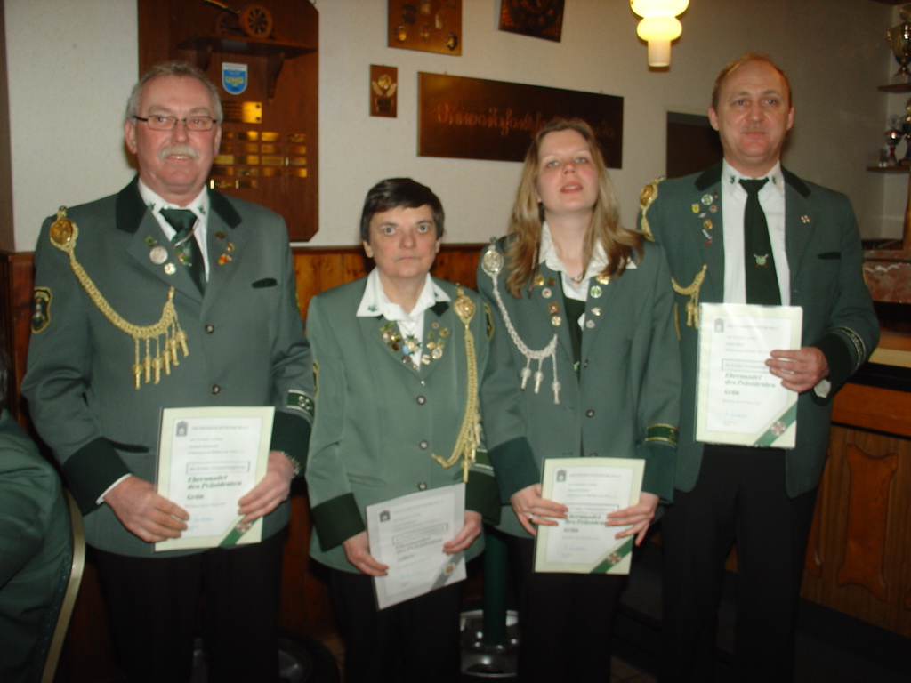 Außerdem bekamen 4 Vorstandsmitglieder eine Ehrung für langjährige Vorstandsarbeit. Dies waren : Luise Sandmann (20 Jahre), Mareen Sander, Norbert Gottwald und Stefan Bünte für 10 Jahre Vorstand. Alle 4 bekamen eine Ehrennadel sowie eine Urkunde vom Deutschen Schützenbund.