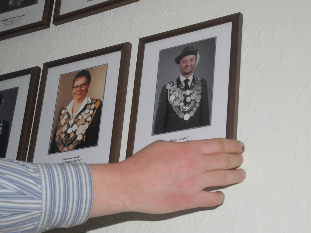 Nun war es für die Kommendeure an der Zeit, die schwierige Aufgabe des Königsbildaufhängens anzugehen. Unter fachkundiger Anleitung unserer Majestät Klaus Weghöft "der Humorvolle" wurde das Bild eingelotet.
