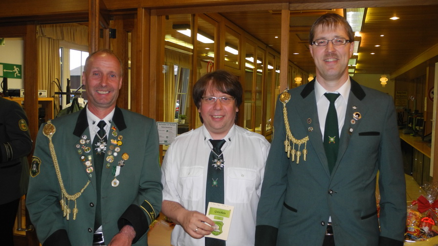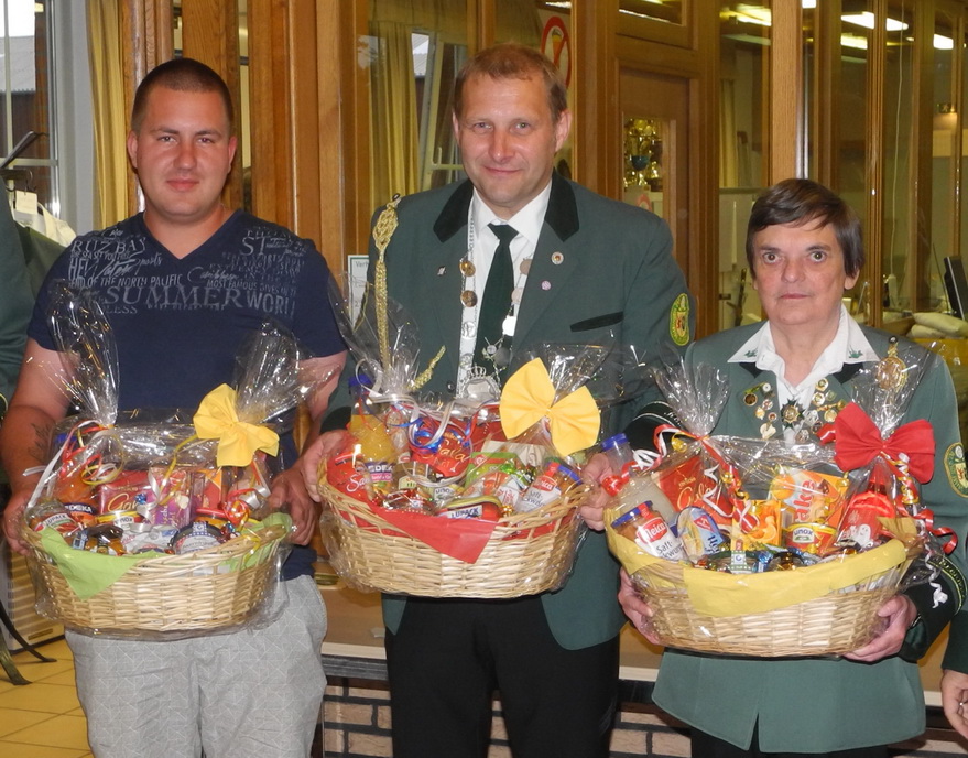 Als letztes wurde dann die Siegerehrung vom Glücksschießen durchgeführt. Dabei musste unser neues Majestätenpaar seine 'Bewährungsprobe' bestehen. Hier konnten sich Luise Sandmann, SM Wilhelm Kenneweg und Max Lowak über einen Prall gefüllten Präsentkorb freuen.